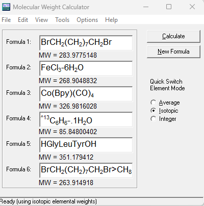 The Molecular Weight Calculator can be used to calculate the molecular weight and percent composition of chemical formulas and amino acids (peptides). It recognizes user-definable abbreviations and custom elemental isotopes. It also includes a Mole/Mass Converter, Mass-to-Charge Converter, Formula Finder, Capillary Flow Calculator, Amino Acid Notation Converter, Isotopic Distribution Calculator, and Peptide Sequence Fragmentation Modeler.